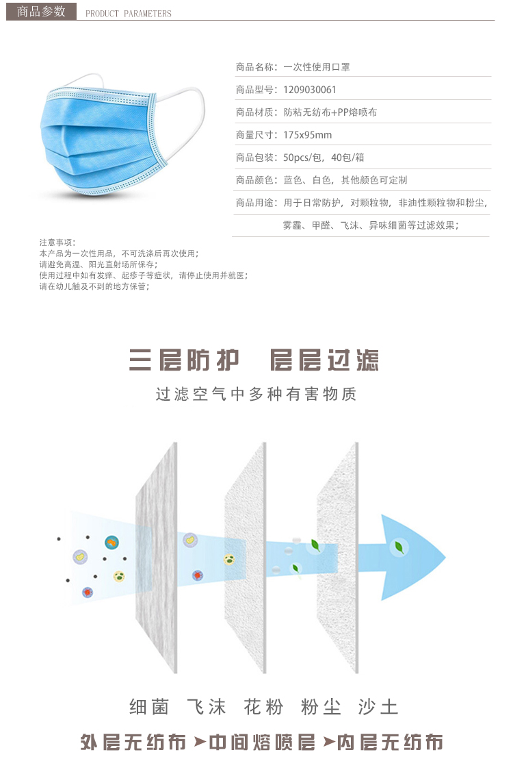 商品材質(zhì):防粘無紡布+PP熔噴布