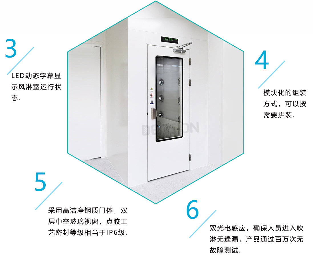 電子連鎖系統(tǒng)聯(lián)動(dòng)LED動(dòng)態(tài)字幕,顯示風(fēng)淋室運(yùn)行狀態(tài)